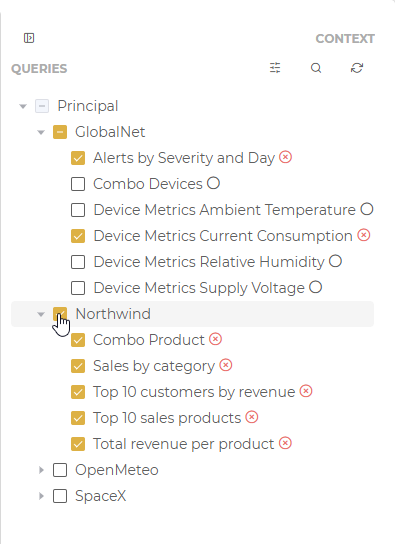 Once the parameters for the selected queries have been configured, the Confirm button is pressed. If the configuration is correct, an orange verification icon appears next to each query, indicating that they are ready to be used as context.