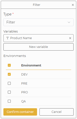 Finally, select the environments to be displayed in the filter and click Add filter. The filter will appear in the editor, where its position and size can be modified.