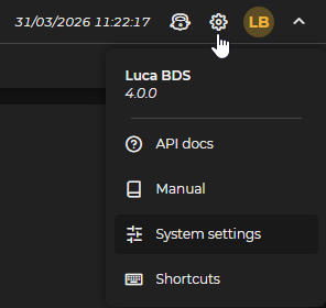 Users with configuration permissions in LUCA can access this section from the context menu, which appears when hovering over the settings icon. If the user has the appropriate permissions, the System Settings option is visible.