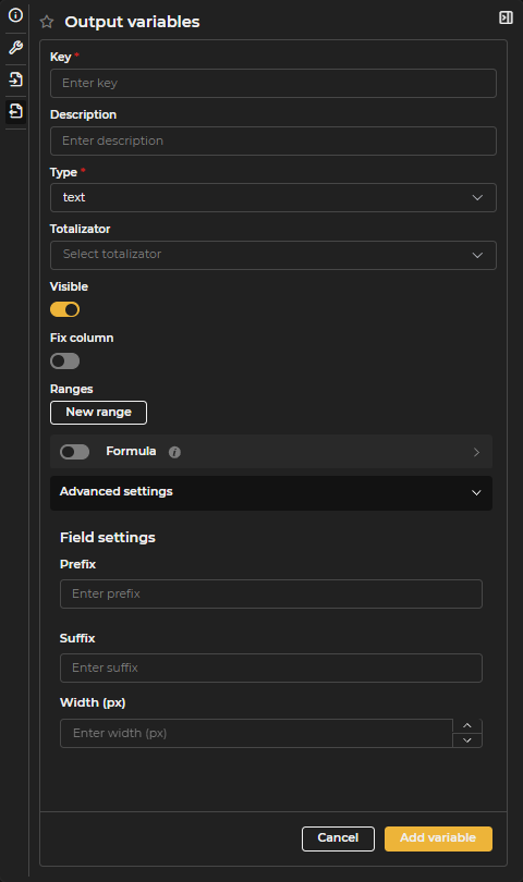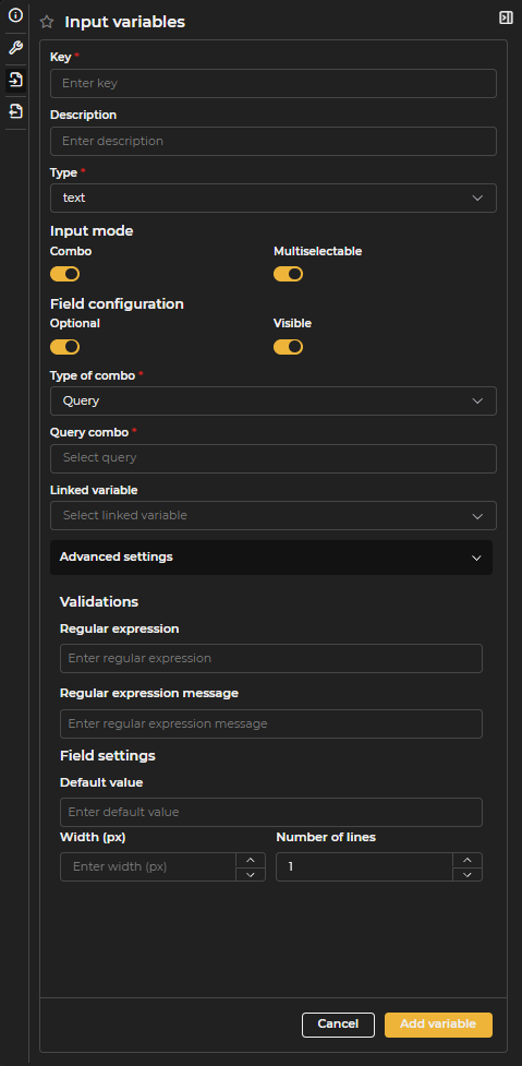 Advanced configuration: Allows defining additional options for each variable, such as validation using regular expressions, minimum and maximum values for numeric inputs, default values, and the width in pixels of the variable.